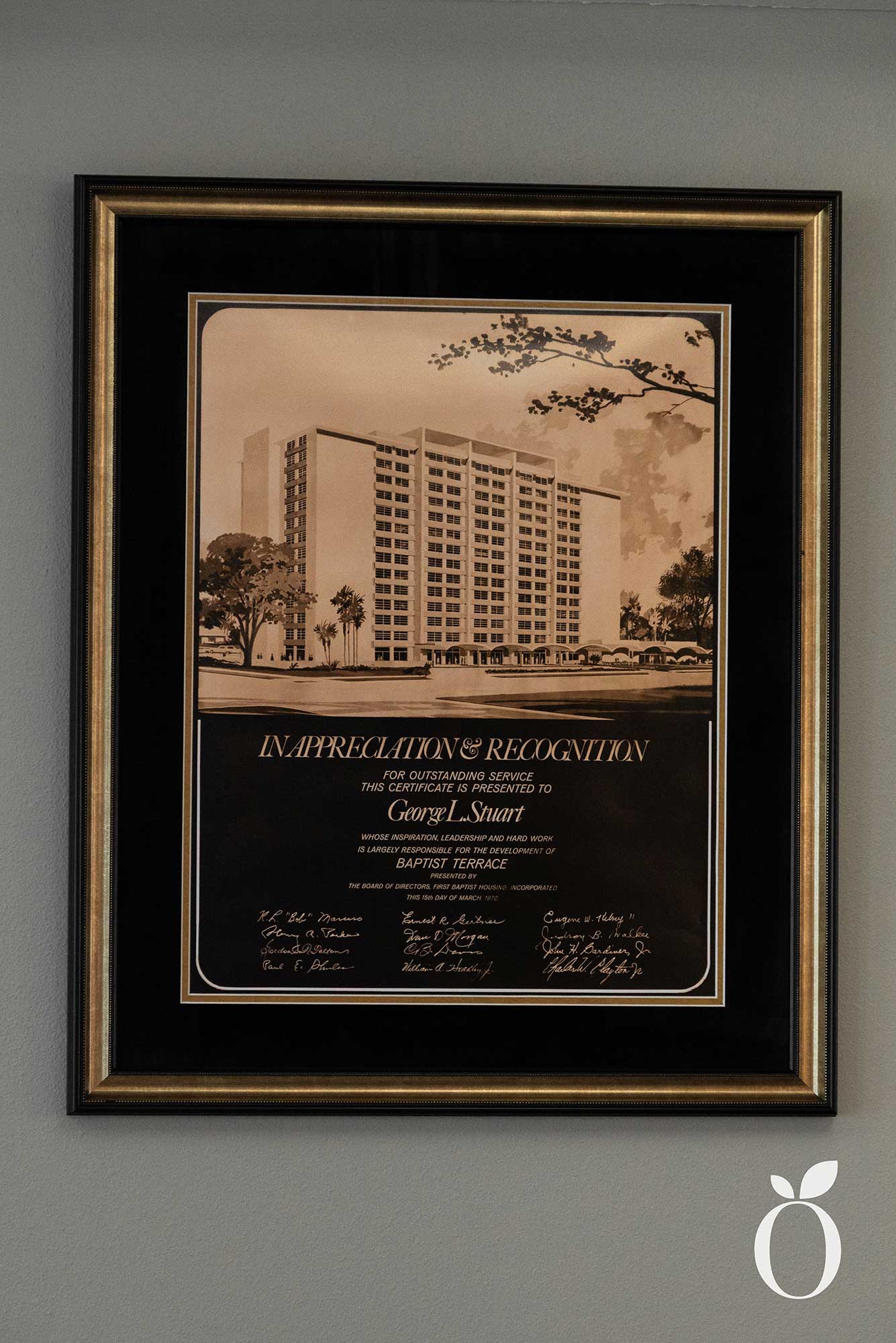 The 14-story tall Baptist Terrace Apartments were built in 1969 by First Baptist Housing. Their goal was to provide affordable living for seniors in the community. Although the apartments are now called The Roberts, and are owned by the Orlando Neighborhood Improvement Corporation, they still serve the same purpose. The building is about a five minute walk from Lake Eola.